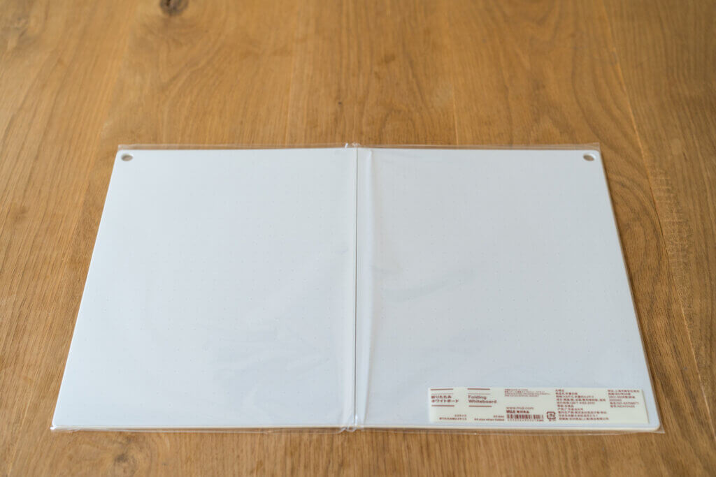 このホワイトボードなんですが、二つ折りになっていて、折って使えばA4、開けばA3になるので置くスペースによって使い分けできるのが便利です。